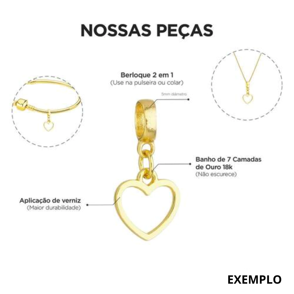 Normalmente as semijoias tem 50milísimo de banho mas, os nossos berloques tem 70milésimo e ainda leva uma camada de verniz importado para aumentar sua durabilidade, por esse motivo, nossa garantia é de 6 meses no banho pois agreditamos no processo da peça Garantia: Garantia de 6 meses no banho da peça